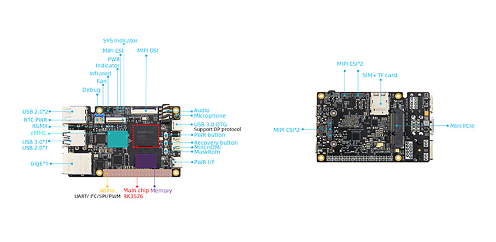 RK3576 இன் மையத்தில் SBC ராக்ஷிப்பின் RK3576 CHIP ஐக் கொண்டுள்ளது, இது பல்வேறு பணிச்சுமைகள் முழுவதும் அதிக திறன் கொண்ட கணினி வடிவமைக்கப்படுகிறது. அதன் 8-கோர் கலப்பின கட்டமைப்பு-4x ARM கார்டெக்ஸ்-ஏ 72 செயல்திறன் கோர்கள் மற்றும் 4 எக்ஸ் கார்டெக்ஸ்-ஏ 53 செயல்திறன் கோர்கள்-ஆர்ம் மாலி-ஜி 52 எம்பி 4 ஜி.பீ.