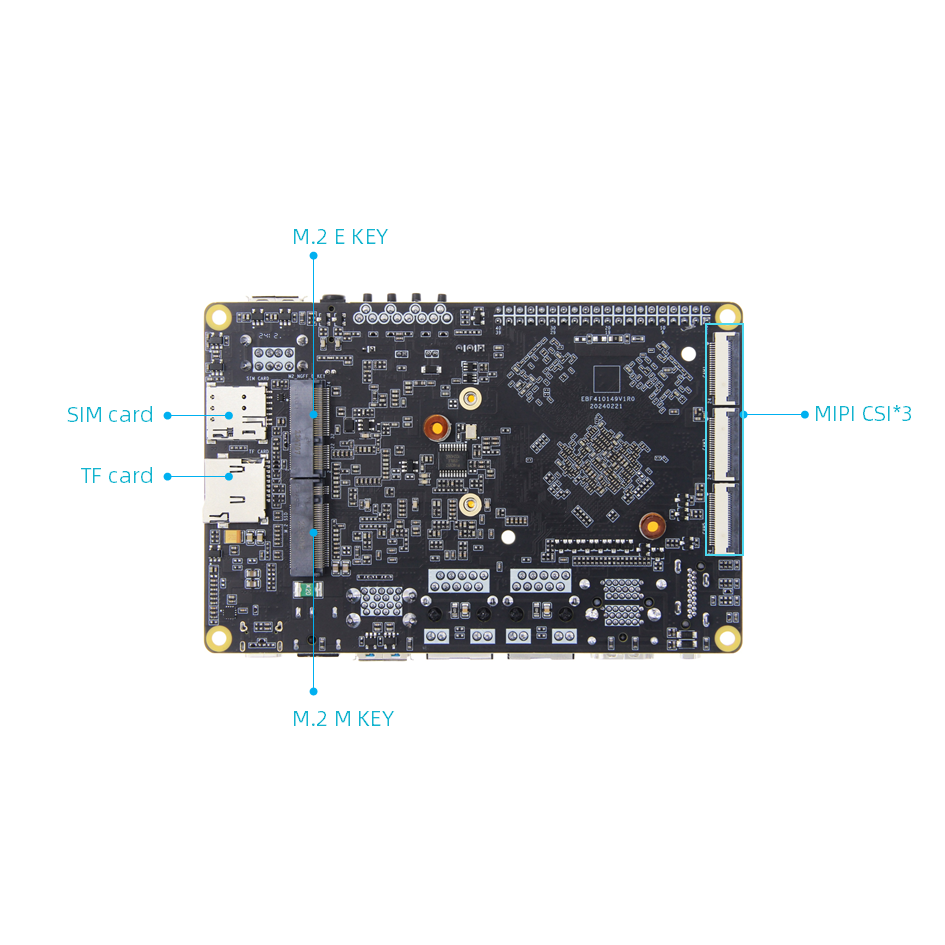 • முக்கிய கட்டமைப்பு: 16GB LPDDR5 RAM + 128GB eMMC, இரட்டை கிகாபிட் ஈதர்நெட் போர்ட்கள், இரண்டு USB 2.0 போர்ட்கள், இரண்டு USB 2.1 போர்ட்கள், ஆறு MIPI CSI போர்ட்கள், இரண்டு MIPI DSI போர்ட்கள், Mini-PCle இடைமுகம் (modules, Wi-Fi கார்டு மற்றவை, வைஃபை 4 நெட்வொர்க்குகளை ஆதரிக்கிறது மினி-PCle இடைமுக தொகுதிகள்), 40-பின் விரிவாக்க போர்ட் (ராஸ்பெர்ரி பை 40-பின் போர்ட்டுடன் இணக்கமானது, PWM, GPIO, PCI Express, SPI, UART மற்றும் CAN ஆகியவற்றை ஆதரிக்கிறது), M.2 M-KEY M.2 SSDகளுடன் இணக்கமானது