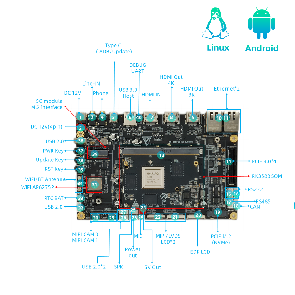 • RK3588 SBC நன்மைகள்: Raspberry Pi தயாரிப்புகளுடன் ஒப்பிடும்போது, RK3588 டெவலப்மெண்ட் போர்டு சிறந்த செயல்திறன், சிறந்த இடைமுகங்கள் மற்றும் அதிக சக்திவாய்ந்த மல்டிமீடியா செயலாக்க திறன்களை வழங்குகிறது, இது AI மற்றும் தொழில்துறை பயன்பாடுகளுக்கு மிகவும் பொருத்தமானது.